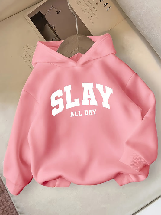 Girls' Pink "SLAY ALL DAY" Hoodie - Spring/Autumn Casual Long-Sleeve Pullover, White Bold Letter Print, Regular Fit Comfortable Style, Lightweight Versatile Hooded Sweatshirt for Girls, Spring Outfit, Autumn Fashion, Trendy D
